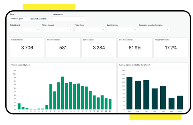 È un potente strumento di analisi dei dati, personalizzabile secondo le tue esigenze. Aiuta a individuare le situazioni da migliorare legate all’assistenza, come colli di bottiglia o inefficienze interne. Analizza ticket, aggiornamenti, SLA e customer satisfaction, mettendo a disposizione strumenti come grafici moderni, filtri e tabelle.