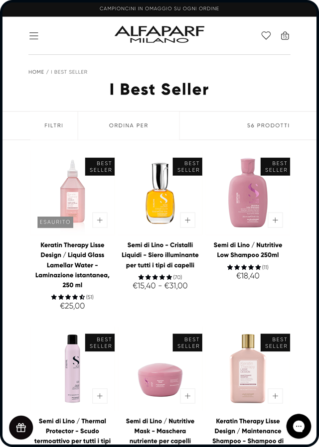 Abbiamo creato pagine dedicate per ciascun marchio, pensate per valorizzare identità, prodotti e storytelling. Inoltre, l’interfaccia è stata personalizzata attraverso l’utilizzo di Custom CSS, che ci ha permesso di adattare la UI alle esigenze dell’esperienza utente mantenendo la struttura tecnica della piattaforma Shopify Plus.