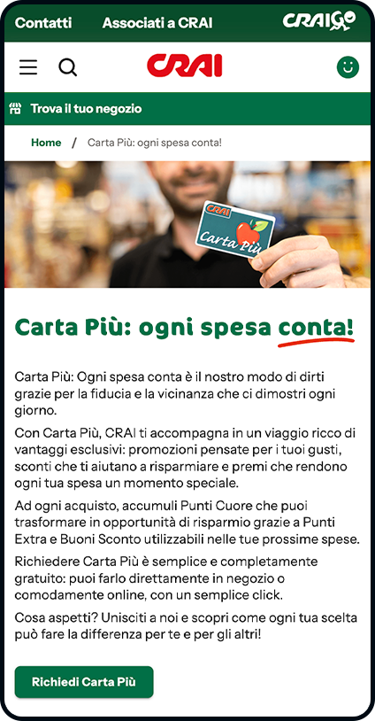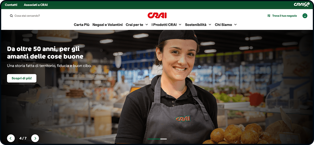Il nuovo sito CRAI rappresenta un’evoluzione solida e strutturata dell’ecosistema digitale del brand: un’esperienza utente moderna e intuitiva, supportata da un’architettura headless scalabile e da una UX/UI capace di dare chiarezza e leggibilità a contenuti ricchi e articolati, accompagnando l’utente lungo lo storytelling del brand in modo naturale e fluido. La fase 2, con l’integrazione del catalogo prodotti, arricchirà ulteriormente l’esperienza, trasformando il sito in un vero hub informativo e commerciale.